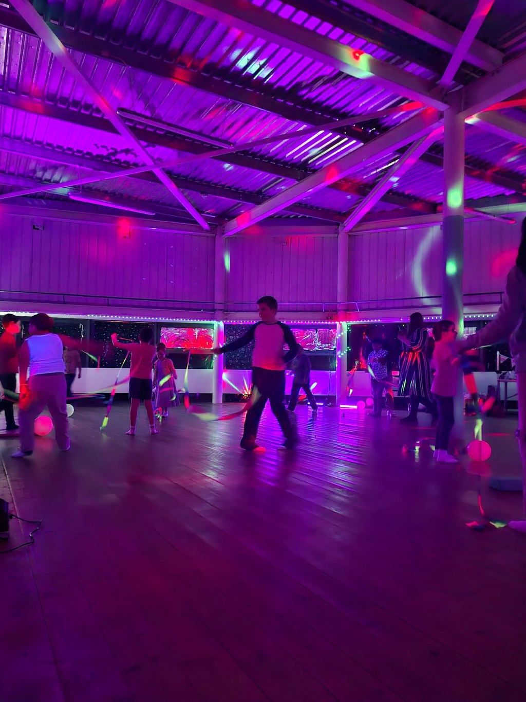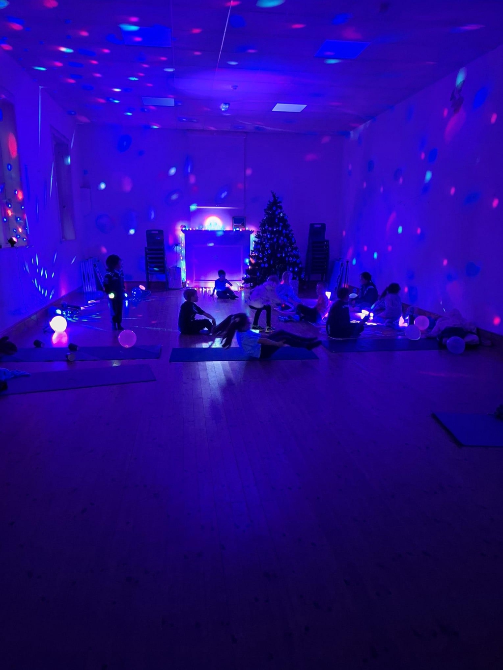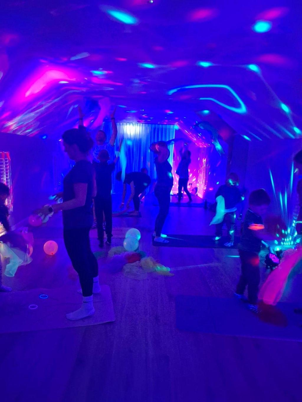 Set under soft dark lighting, the class is active, fun and full of energy, combining dance, yoga and playful movement with glowing props that spark curiosity and imagination. Children use light-up glow sticks, luminous ribbons, glowing balls and other sensory props, turning movement into a joyful, immersive experience.